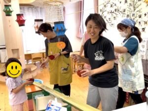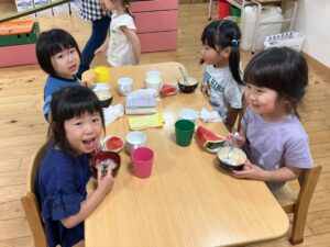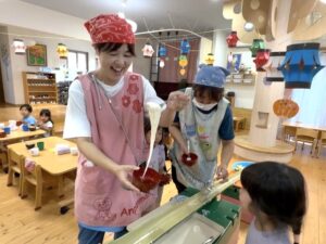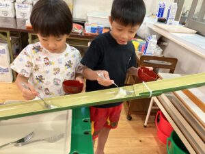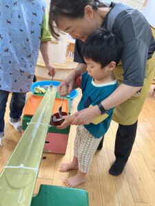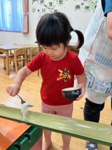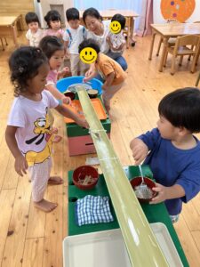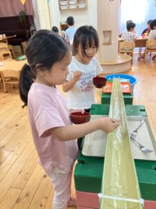 お昼寝から明けランチルームに向かうと、そこには準備された流しそうめん。