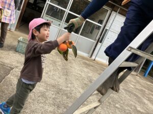 さっそく5歳児どんぐりぐみさんと柿もぎへ。